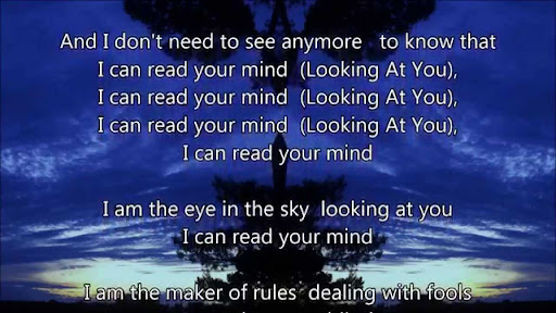 The Sun In Your Eyes Made Some Of The Lies Worth Believing I Am The Eye In The Sky, Looking At You I Can Read Your Mind I Am The Maker Of Rules, Dealing With Fools I Can Cheat You Blind And I Don't Need To See Any More To Know That I Can Read Your Mind (Looking At You) I Can Read Your Mind (Looking At You) I Can Read Your Mind (Looking At You)